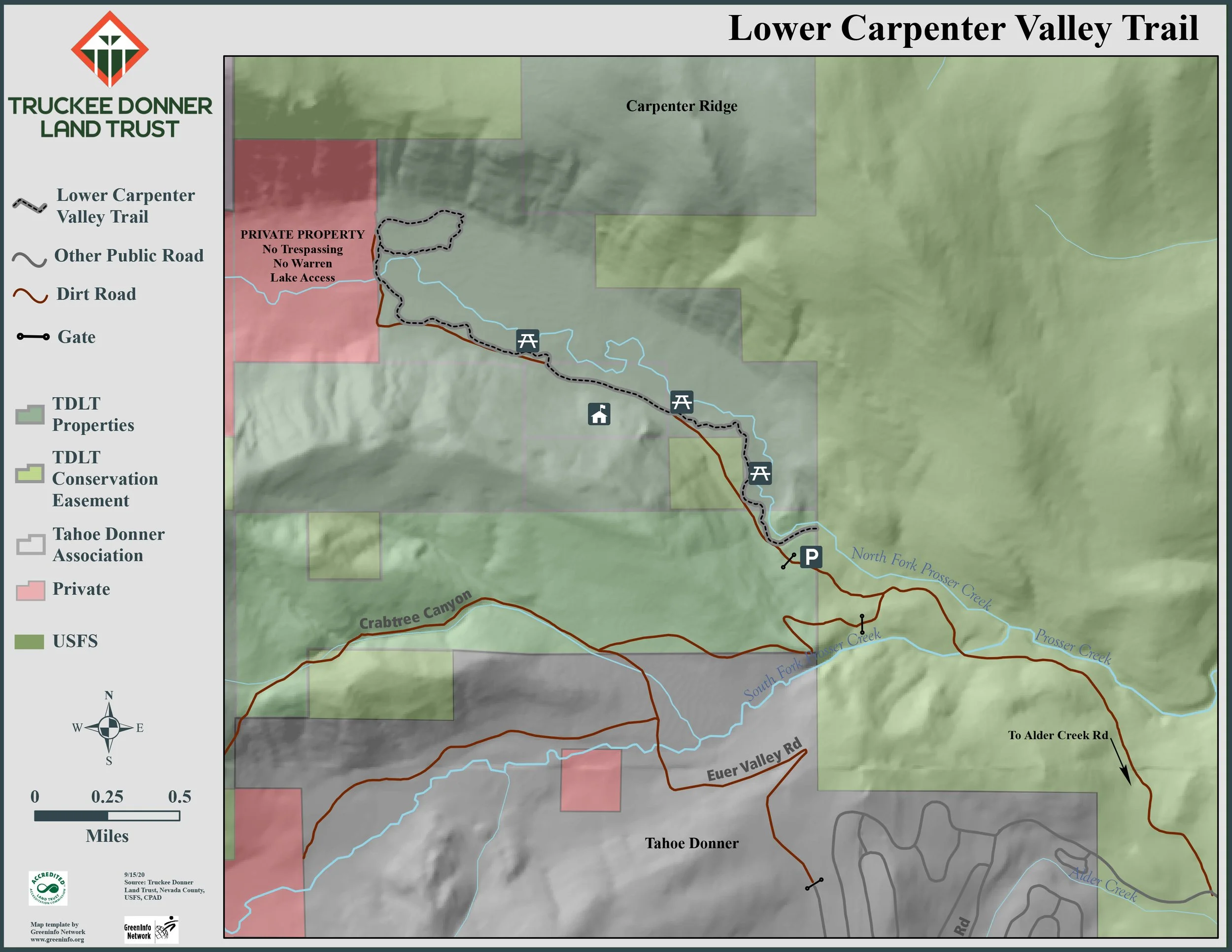 Approximately 3 miles as the crow flies North of Carpenter Valley over Carpenter Peak, it’s on the Land Trust’s to do list to link Lower Carpenter Valley to Independence Lake via trail. Stay tuned!