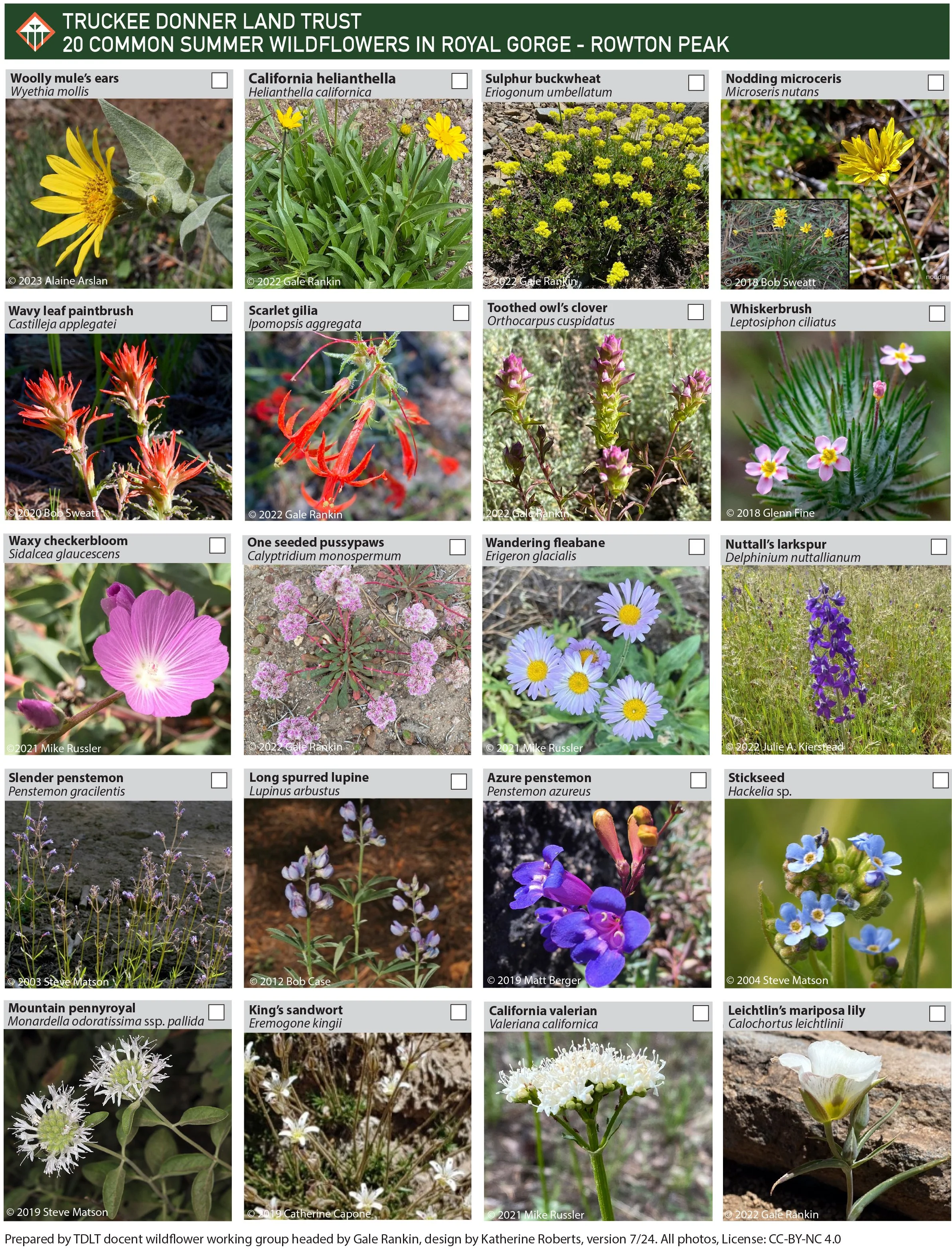 From the Hoelter Hall Trailhead, starting at the kiosk at the far end of the parking area, turn left uphill and south onto the trail. In a short distance, this feeder trail merges with one of the main Royal Gorge ski trails. Bearing left, follow this main trail generally north and parallel to the paved Soda Springs Road, which is below and to the left. In 0.4 of a mile, the trail descends and crosses a creek with a large culvert. Another trail comes in from the left. Cross the culvert bearing right at this junction. A couple hundred yards after the culvert the trail comes to a four-way intersection. Go straight and uphill. There is a Royal Gorge sign marking this as the Claim Jumper Trail. Claim Jumper is a gentle climb lined with seasonal wildflowers.